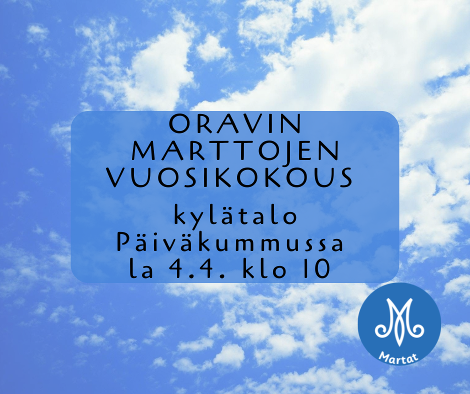 Tervetuloa Oravin Marttojen vuosikokoukseen Ahvensalmen kylätalo Päiväkumpuun lauantaina 4.4.2026 klo 10:00 alkaen. Kokouksessa käsitellään sääntömääräiset asiat. Tervetuloa mukaan suunnittelemaan…